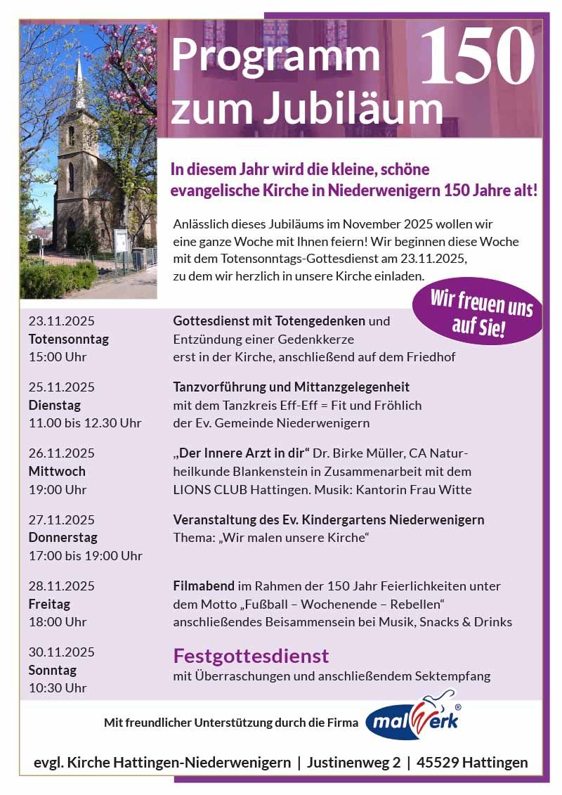 Festliche Bläsermusik mit dem Hattinger Blechbläser Ensemble, Solobläser, Renate Lange (Orgel) und dem Bläserchor unter Leitung von Alfried Schüler. Der Chor wurde vor vierzig Jahren im Frühjahr 1985 in Burgaltendorf ins Leben gerufen, ab Dezember des Jahres als Gruppe des damaligen CVJM. Zu den wöchentlichen Chorproben treffen sich zurzeit regelmäßig sieben Bläser, sporadisch mit zwei Bläsern verstärkt aus dem Kettwiger Posaunenchor.